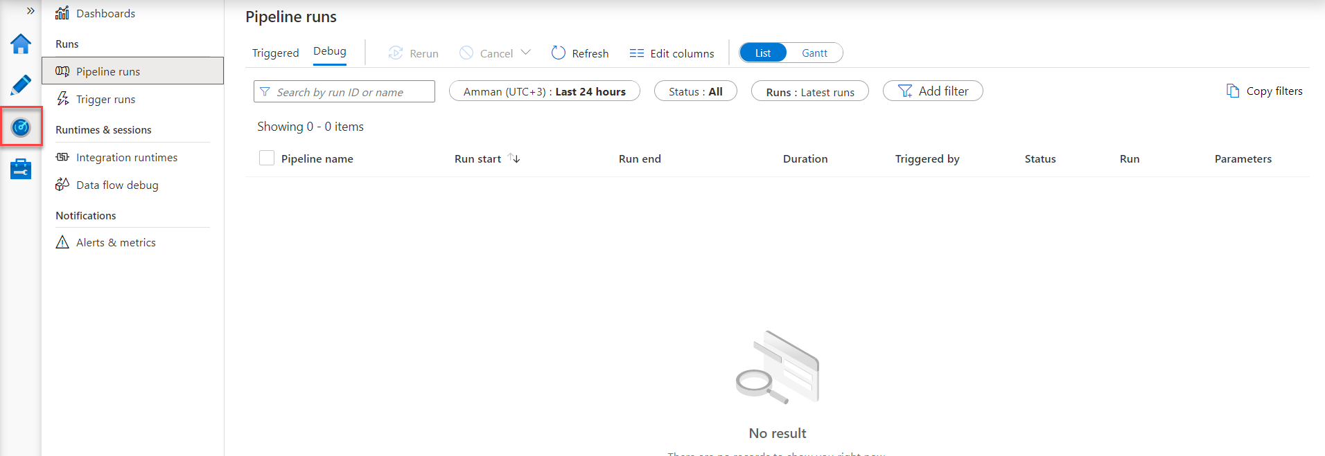 Moving to the Monitor page of the Azure Data Factory and check the pipeline runs, nothing will be displayed, as the pipeline was executed under the debug mode, as shown below: