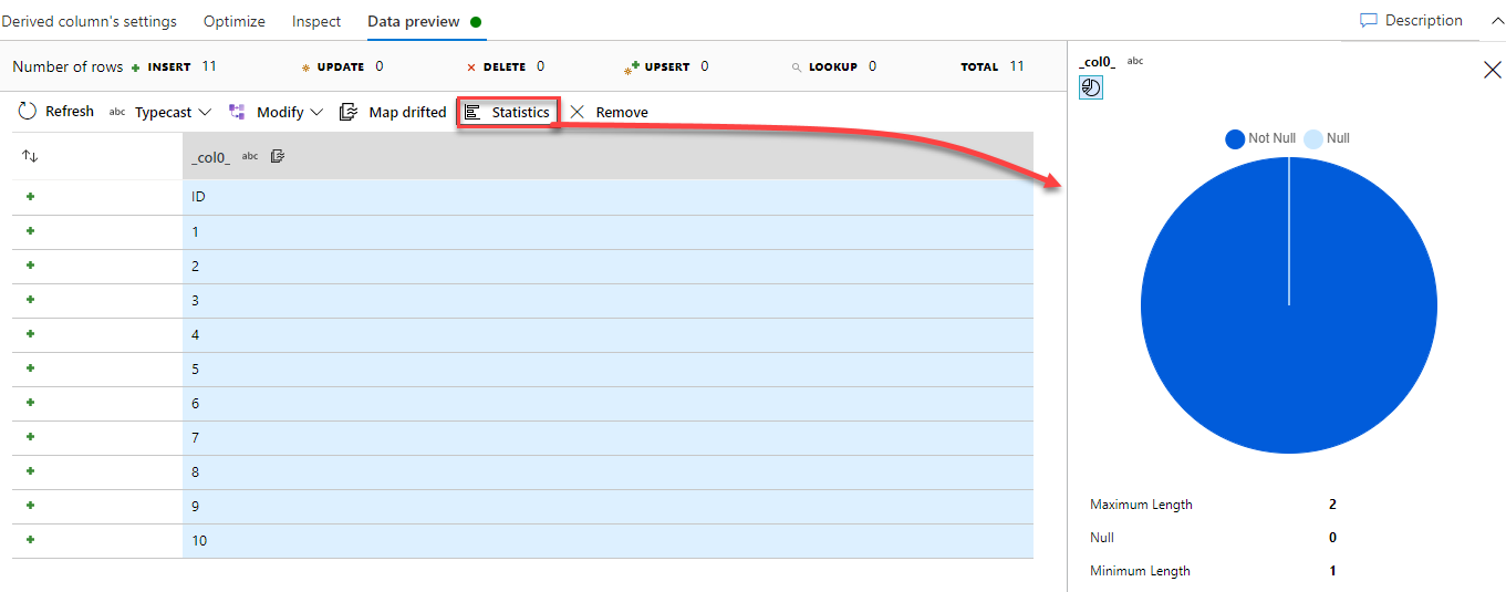 To get statistical data about the data distribution for a specific column within the Data Preview tab, choose the column and click on the Statistics button, where a chart will be displayed, showing the percentage of the Null and Not Null data in the selected column and other useful statistical information as shown below: