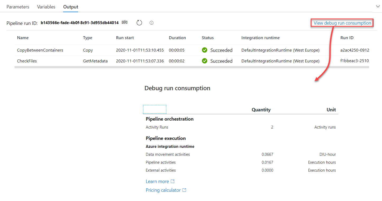 We still have other secrets hidden in the Output tab of the debug mode execution! As we care about the functionality and the performance of the pipeline execution, we also care about the resources that are consumed by this pipeline execution, which help in modifying the pipeline in order to minimize the cost of the pipeline execution, or just to have an estimation for the resources consumption of that pipeline after scheduling it to be executed automatically. This can be checked from the View debug run consumption option, under the Output tab, as shown below: