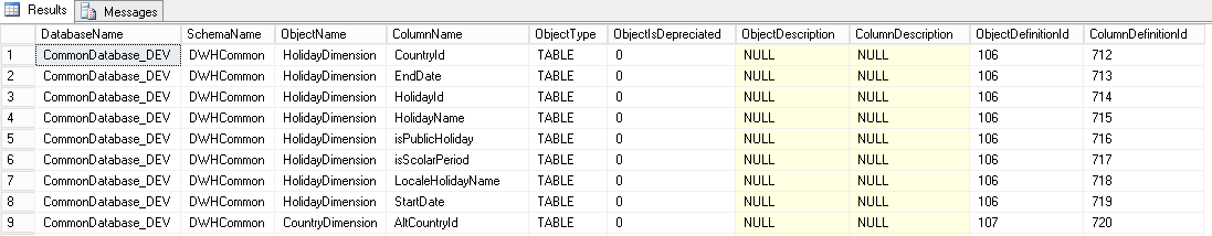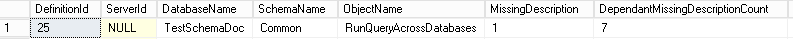 Once it’s done, let’s run again the query against SchemaObjectDictionaryMissingDescription view and we can see that the DependentMissingDescriptionCount has a value of 7 instead of 8 previously.