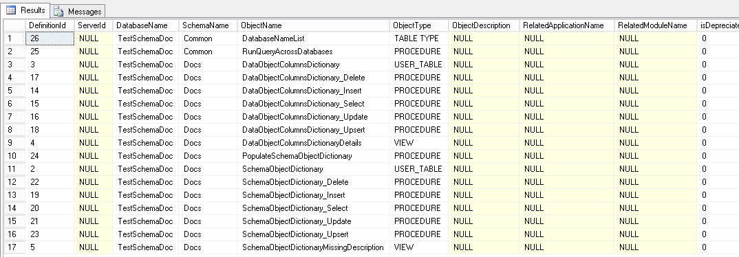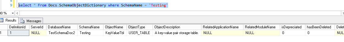 DECLARE @DbName SYSNAME; SET @DbName = DB_NAME(); EXEC [Docs].[PopulateSchemaObjectDictionary] @DatabaseName = @DbName, @SchemaName = 'Testing', @Debug = 1 ; |