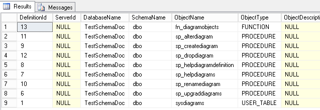 As final objective is to document every SQL Server object inside a given database, we will also create a view that we will call SchemaObjectDictionaryMissingDescription. This view will return a list of objects with missing documentation either about itself or about one or more of its columns.