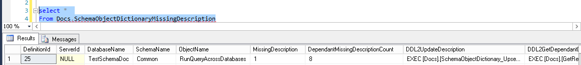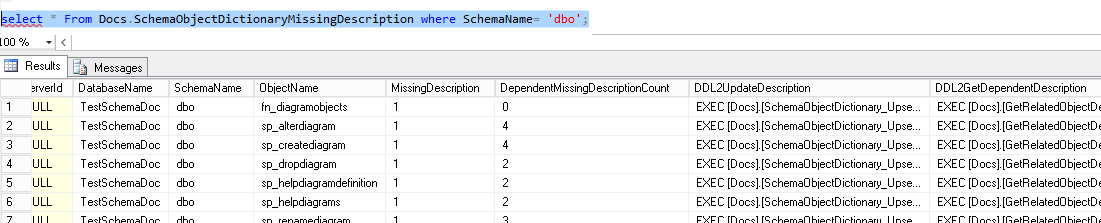 There are two columns we need to look at. First one is the MissingDescription column. If its value is 1, then we need to document the SQL Server object itself. This can be performed easily by editing and running the statement we get back from DDL2UpdateDescription column.