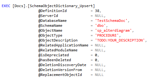 Here is an example call to this procedure in the context of documenting a function called Testing.GetDocTypeCount in TestSchemaDoc database.