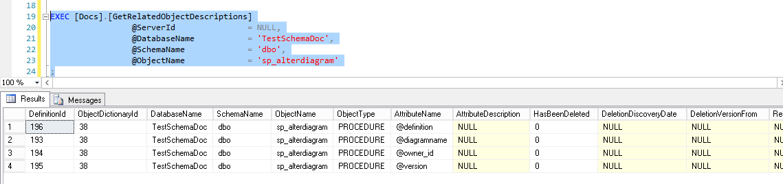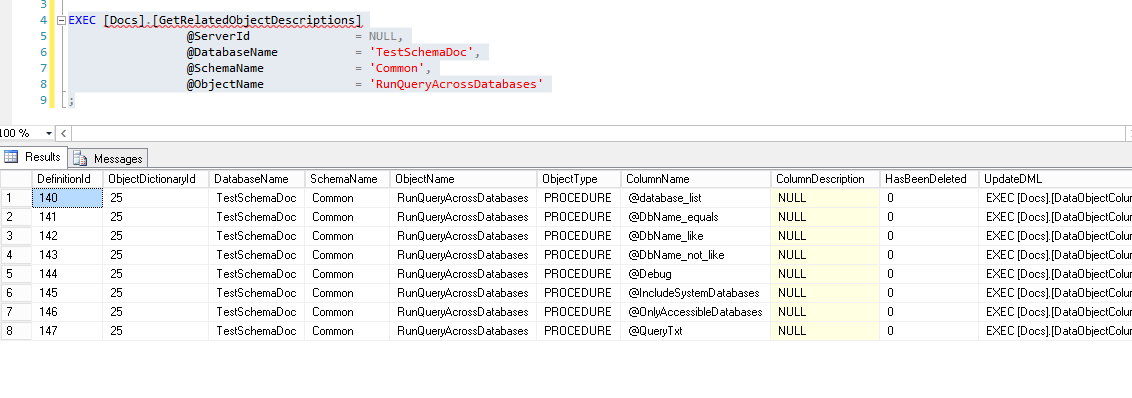 EXEC [Docs].[GetRelatedObjectDescriptions] @ServerId = NULL, @DatabaseName = 'TestSchemaDoc', @SchemaName = 'Common', @ObjectName = 'RunQueryAcrossDatabases' ; |