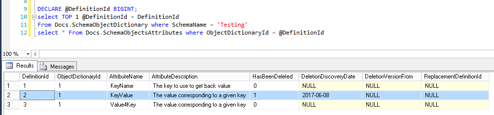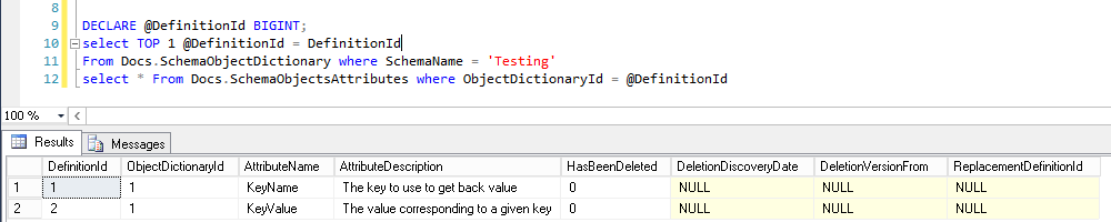 As SchemaObjectsAttributes table only contains a reference to a schema object definition in SchemaObjectDictionary table, we will create a view that will join both tables. This view is called SchemaObjectsAttributesDetails and the query use to define it is as follows: