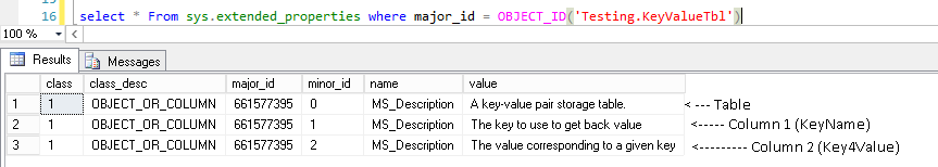 -- Adding to columns EXEC sp_addextendedproperty @name = N'MS_Description',@value = 'The key to use to get back value', @level0type = N'Schema', @level0name = 'Testing', @level1type = N'Table', @level1name = 'KeyValueTbl', @level2type = N'Column', @level2name = 'KeyName'; GO EXEC sp_addextendedproperty @name = N'MS_Description',@value = 'The value corresponding to a given key', @level0type = N'Schema', @level0name = 'Testing', @level1type = N'Table', @level1name = 'KeyValueTbl', @level2type = N'Column', @level2name = 'KeyValue'; GO |