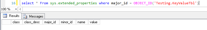 Let’s create a table with defined extended property and check that it’s well added in dictionary tables.