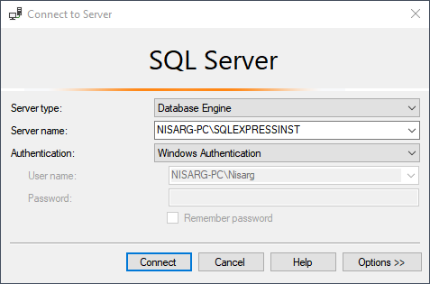 As the SQL Server 2016 express download and installed, we are going to use SQL Server management studio to verify the connectivity. Open the SQL Server management studio and in the connect to the server screen, select Database Engine as Server type, NISARG-PC\SQLEXPRESSINST as server name, Select Windows Authentication as the authentication method and click on Connect.