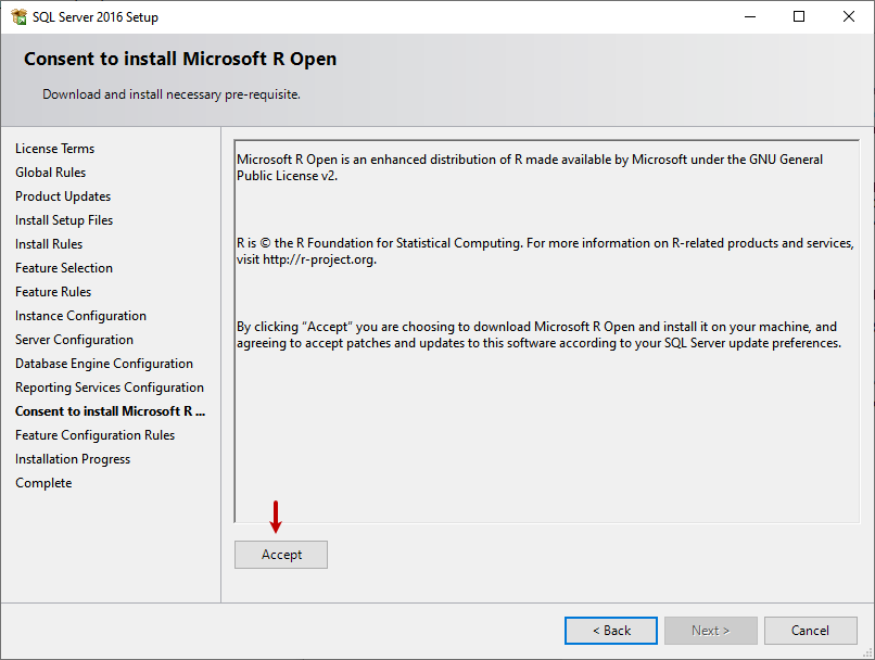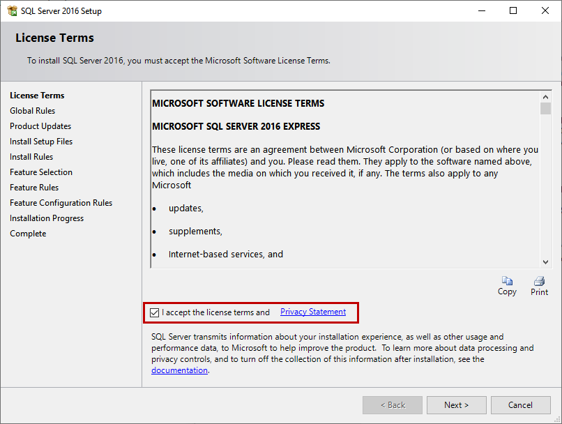 You can view the Microsoft Software License terms and Microsoft SQL Server 2016 express edition license terms on the License Term screen. Click on Accept license terms.