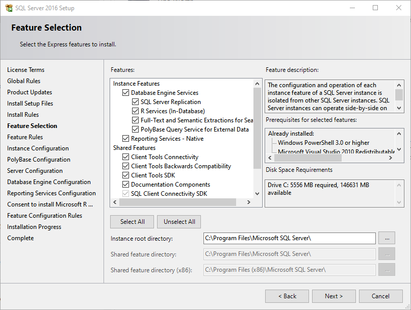 On the feature selection screen, you can select the feature that you want to install. Select all the instance features and click Next.