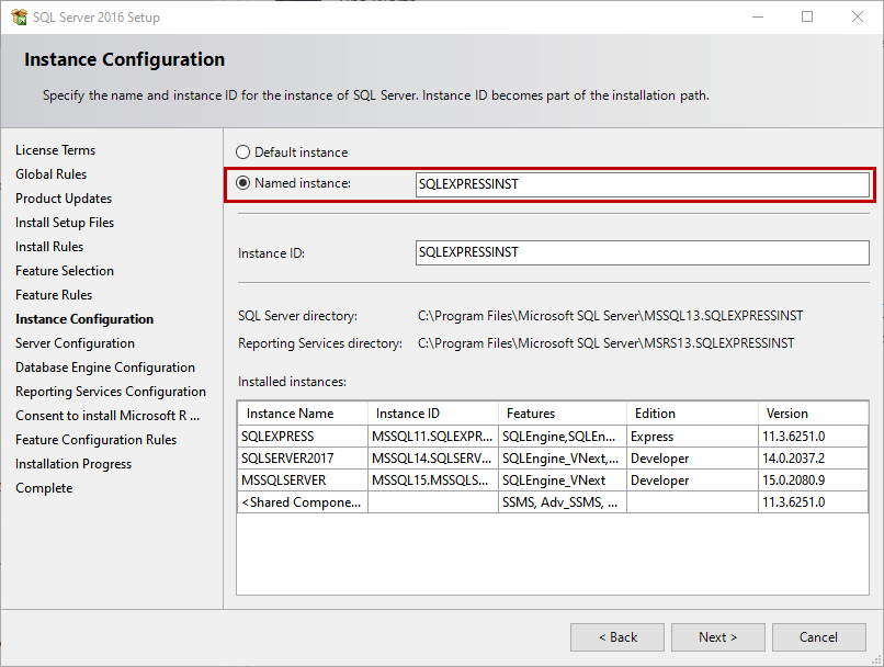 On the instance configuration screen, provide the instance details. If you select Default instance, then the installer will create an instance named MSSQLSERVER. If you want to create a named instance, then provide the instance name in Named Instance. We are creating a named instance, so provide SQLEXPRESSINST as an instance name.