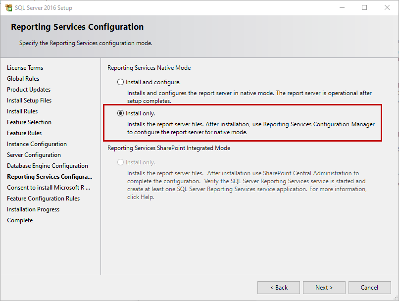 - Install and configure: This option will install the reporting service, and when the SQL Server installation completes, it configures the reporting services