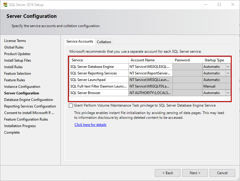 On the Server configuration screen, provide the credentials of the SQL Server service accounts and database collation. I have used the default settings.