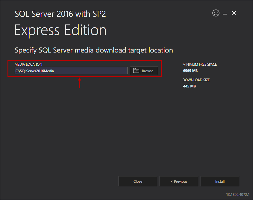 On the next screen, you must specify the media location. The SQL Server will download the installation files on the location specified in the media location textbox. The download size of the media files is 445MB.