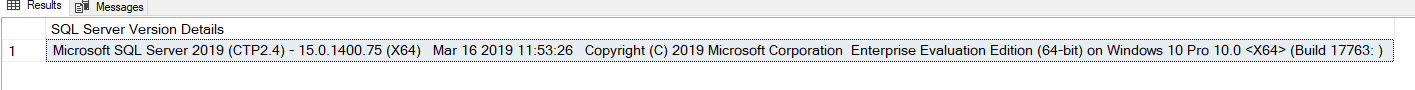 “Microsoft SQL Server 2019 (CTP2.4) – 15.0.1400.75 (X64) Mar 16 2019 11:53:26 Copyright (C) 2019 Microsoft Corporation Enterprise Evaluation Edition (64-bit) on Windows 10 Pro 10.0 <X64> (Build 17763: )”