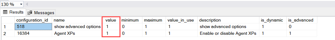- One (1): This value indicates that the SQL Server extended stored procedure OR Agent XPs is enabled
