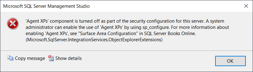 When we start the SQL Server Agent service, by default, the component Agent XPs should be enabled automatically, but sometimes, it is not, and then we have to manually enable it by changing the values of the configuration parameter, under those circumstances, you might receive an error Agent XPs disabled.