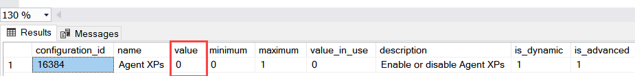 - Zero (0): This value indicates that SQL Server extended stored procedure OR Agent XPs are disabled
