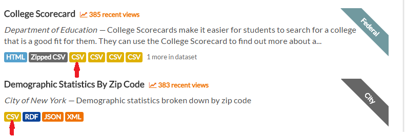 We will download the first two dataset CSV files, “College Scorecard” and “Demographic Statistics By Zip Code”, just click the arrow-pointed two links as shown below, and two CSV files will be downloaded.