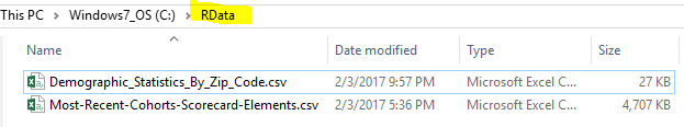 After downloading the two files, we can move the “Consumer_complain.csv” and “Most-Recent-Cohorts-Scorecard-Elements.csv” to a designated folder. In my case, I created a folder C:\RData and put them there as shown below