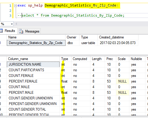 We notice that all columns are created using the original names in the source csv file with the proper data type.