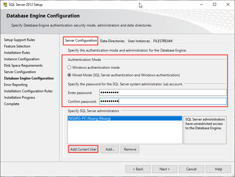 1. You can configure the authentication mode and specify the default SQL Server administrator from the Server configuration tab. You can choose Windows Authentication or mixed authentication (Windows authentication + SQL Server authentication). If you enable the Mixed mode, then you must provide the password of the “sa” user. Also, you must specify at least one SQL Server administrator. If you want to add yourself as a SQL Admin, then click on “Add Current Users.” See the following image: