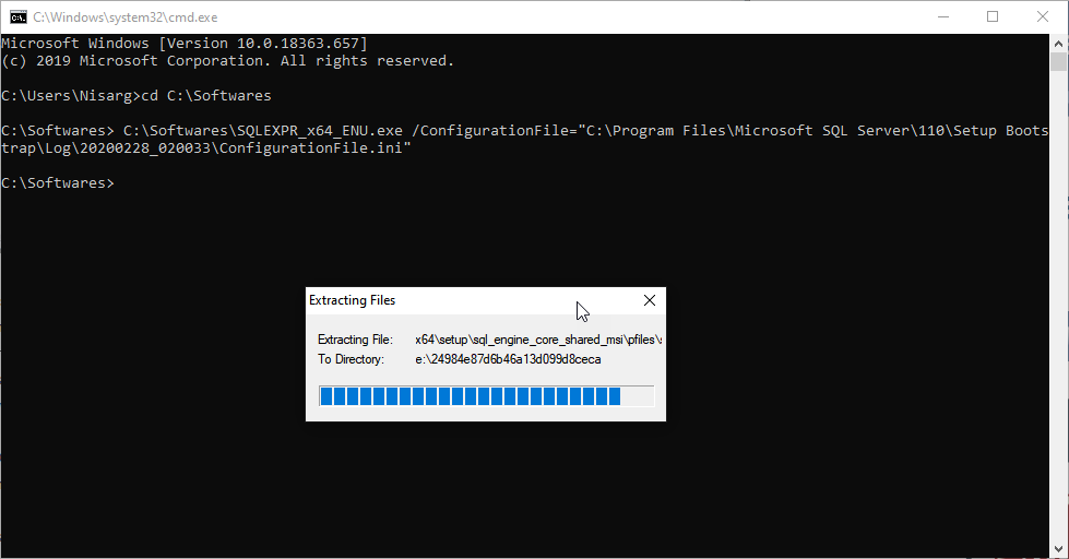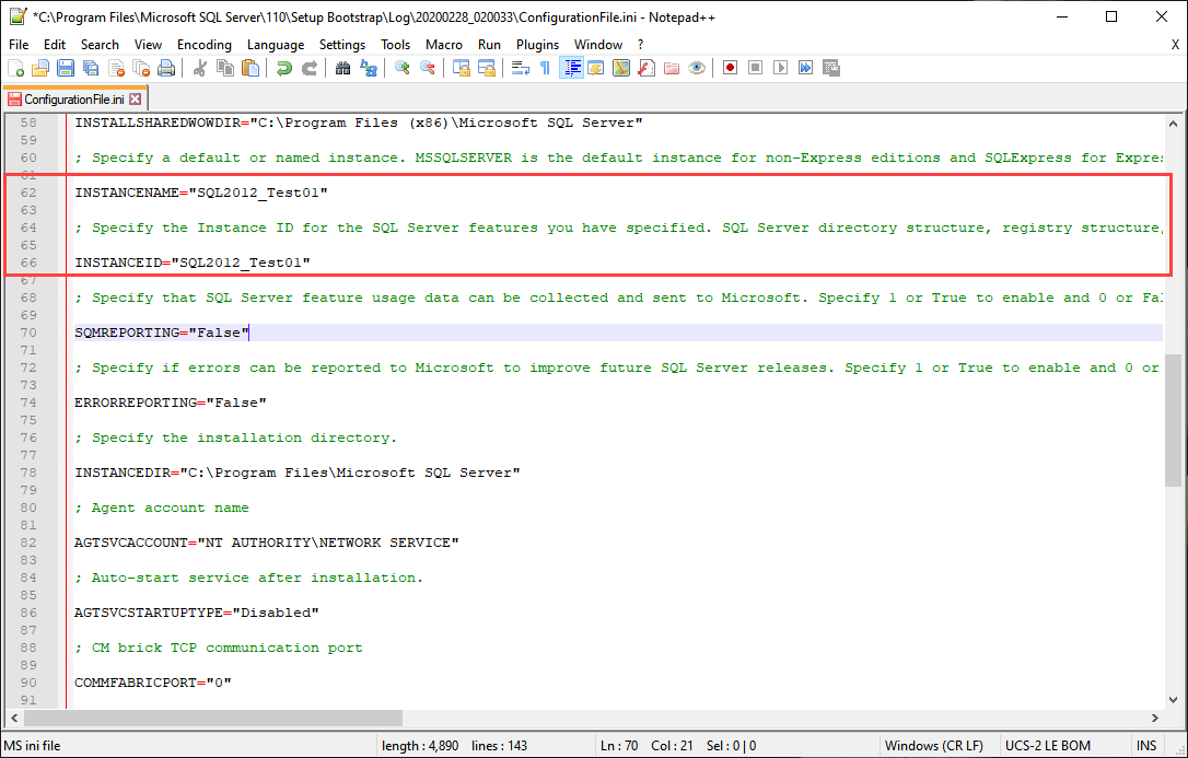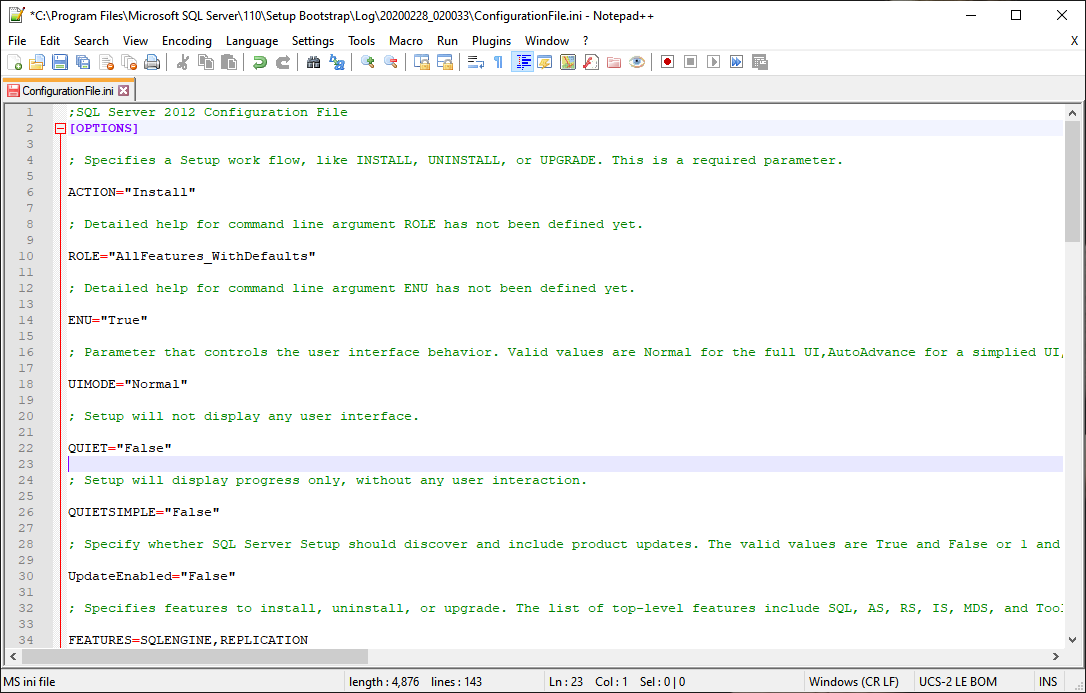 Once the values of all the parameters are set, save the file and run the following command in DOS or PowerShell to install SQL Server.