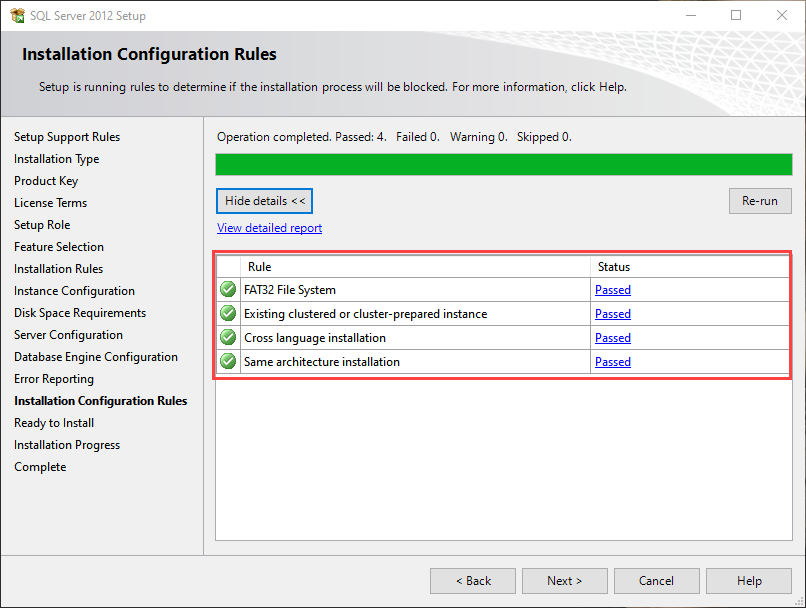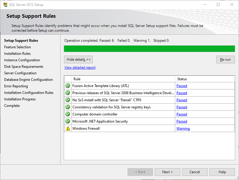 On the Setup Support Rules screen, the installer checks all the mandatory rules which are required to be passed. If you receive any error, then fix it and click on next.