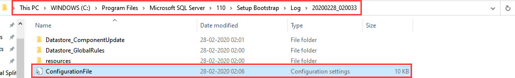 The above command runs the SQL server installer. On the “Ready to install” screen, you can see the path of the configuration file.