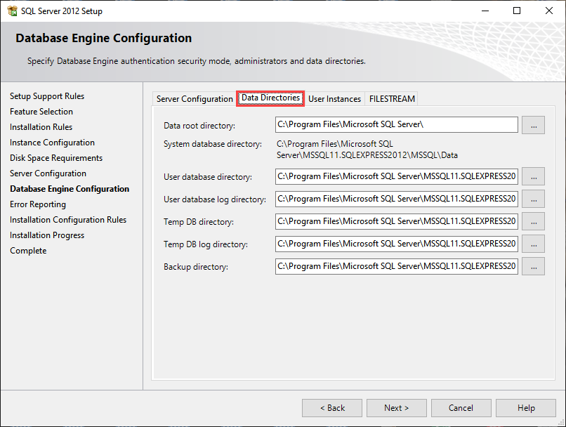 2. Change the default location of User database files and log files, tempdb data files, and log files and default backup directory. See the following image: