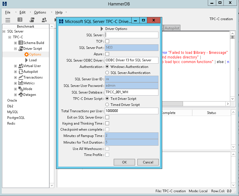 To do so, we will first step create an empty database (with HammerDb) called [TPCC_x_WH] where x represents the number of warehouses we will create. The approximate (but unconfirmed) database size computation formula is 100Mb per warehouse.