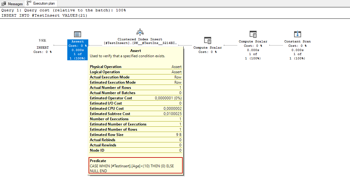 In general, we don’t see an assert operator in the select queries because the assert operator task is to validate certain conditions in the query plan. For example, when we insert a row into the table that includes either check constraint or foreign key constraint, the assert operator validates the inserted value. In the following query execution, we will see an assert operator that validates the inserted value.