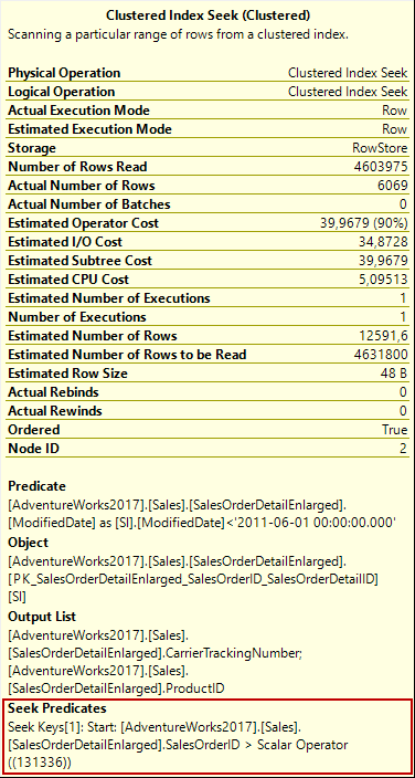 For our example, the index seek operator directly access the 4.603.975 number of rows, and then all these rows are filtered because of the ModifiedDate condition so the matched rows are decreased to 6069 rows. This issue causes to consume more I/O because of the read irrelevant rows.