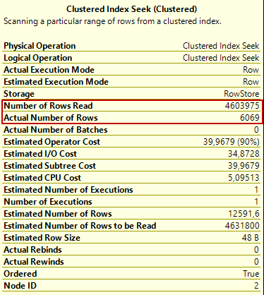 On the clustered index seek properties, the first point that can leap to eyes is a dramatic difference between the Number of Rows Read and the Actual Number of Rows. The Number of Rows Read attribute indicates the total number of the rows that have read by the underlined operator. On the other hand, the Actual Number of Rows attribute gives information about how many rows are returned from the operator.