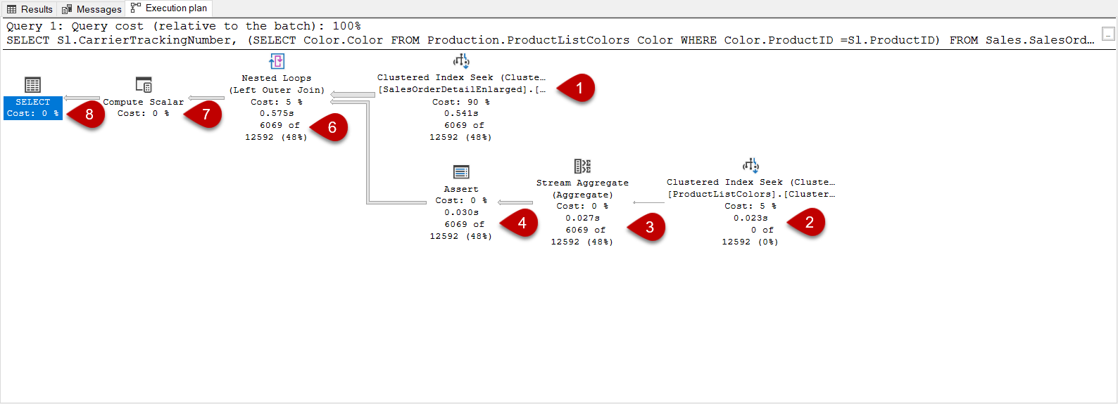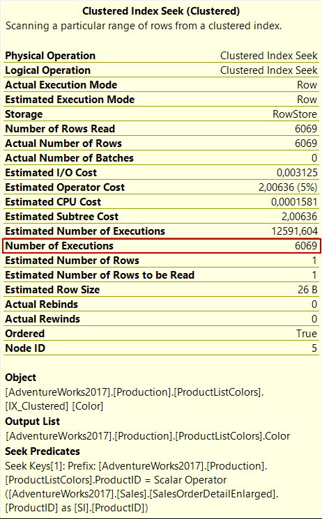 The second index seek operator which is numbered as 2 tasks is to access ProductListColors and return the Color row according to ProductId. The number of executions attribute identifies this operation was performed 6069 times.