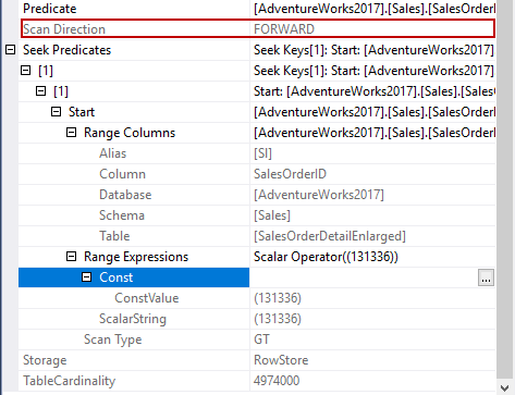 In clustered index tooltip, we can easily realize that a range scan method is performed when we observe the seek predicates attribute. In this method, SQL Server reaches into the first row that matches the specified filter condition, and then it begins to scan all index pages until to reach the non-qualified row. This is because there is a logically ordered interconnection between the index pages and these pages include sequential data according to the clustered index key column. For our example, the storage engine reaches into the index page that includes ProductID equals 131336 and then start to read all index until the end of the index. The Scan Direction attribute of the clustered index seeks property shows the scan direction.