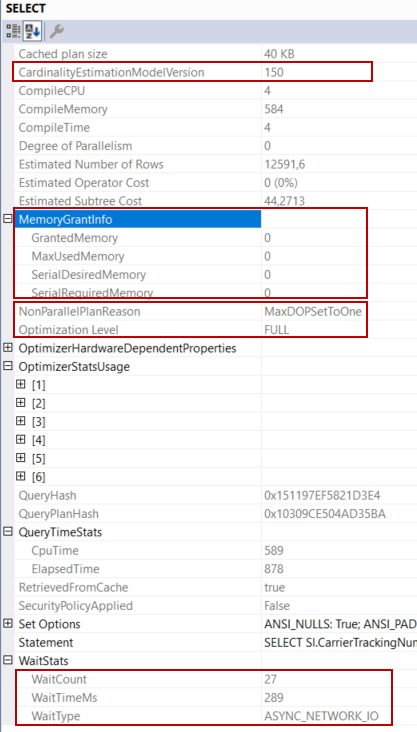Query memory grant is used to store temporary row data during the execution of the query but, there isn’t any operator that needs memory for this query. For this reason, all MemoryGrantInfo child attributes show the zero. NonParallelPlanReason specifies, why the query optimizer does not generate a parallel plan. OptimizationLevel attribute value is FULL and it means that the optimizer completes all query optimization phases. WaitStats attribute shows which wait types occur during the execution of the query.
