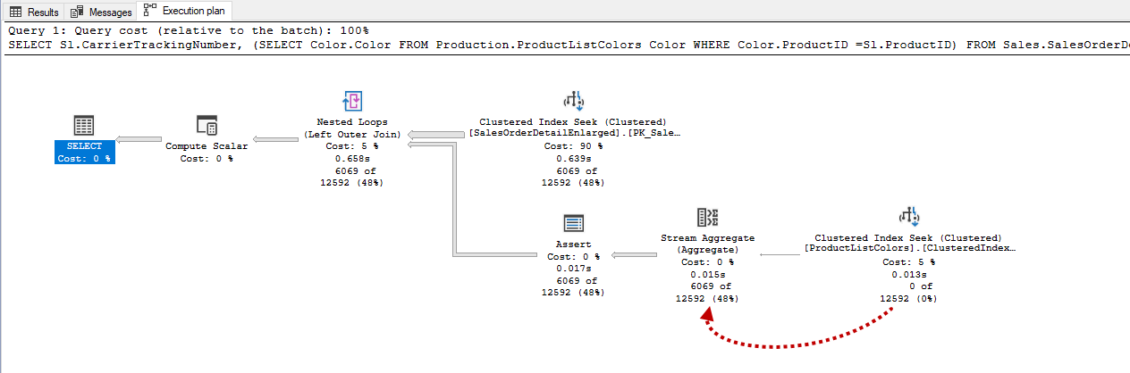 The reason for this change in the query plan is the unique constraint because the query optimizer knows that the ProductListColors table does not contain any duplicate row for the ProductId data. In this circumstance, the execution plan is changed by the query optimizer.