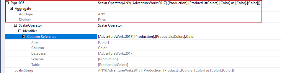 The Expr1005 column returns only one color value because of the ANY function.