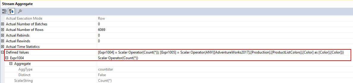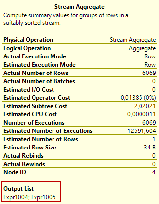 The stream aggregate operator returns one row that includes Expr1004 and Expr1005 columns.