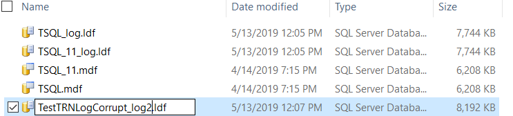 ALTER DATABASE [TestTRNLogCorrupt] REBUILD LOG ON (NAME= logicalname, FILENAME='C:\Program Files\Microsoft SQL Server\MSSQL13.MSSQLSERVER\MSSQL\DATA\TestTRNLogCorrupt_log.ldf') GO |