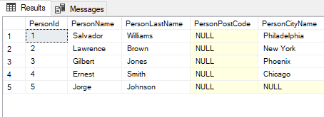 CREATE TABLE dbo.Persons ( PersonId INT PRIMARY KEY IDENTITY(1, 1) NOT NULL, PersonName VARCHAR(100) NULL, PersonLastName VARCHAR(100) NULL, PersonPostCode VARCHAR(100) NULL, PersonCityName VARCHAR(100) NULL) GO CREATE TABLE AddressList( [AddressId] [int] PRIMARY KEY IDENTITY(1,1) NOT NULL, [PersonId] [int] NULL, [PostCode] [varchar](100) NULL, [City] [varchar](100) NULL) GO INSERT INTO Persons (PersonName, PersonLastName ) VALUES (N'Salvador', N'Williams'), (N'Lawrence', N'Brown'), ( N'Gilbert', N'Jones'), ( N'Ernest', N'Smith'), ( N'Jorge', N'Johnson') GO INSERT INTO AddressList (PersonId, PostCode, City) VALUES (1, N'07145', N'Philadelphia'), (2, N'68443', N'New York'), (3, N'50675', N'Phoenix'), (4, N'96573', N'Chicago') SELECT * FROM Persons SELECT * FROM AddressList |