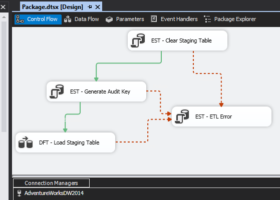 Now to demonstrate as to how changes to the Package Parts gets applied across packages referencing it, we will attempt to make changes to the Package Parts’ connection name. The existing version of the Package Part has the AdvetureWorks2014 connection name, as can be seen in Figure 13 from one of the SSIS Packages that are referencing our Package Part, PackageTemplate.dtsxp.