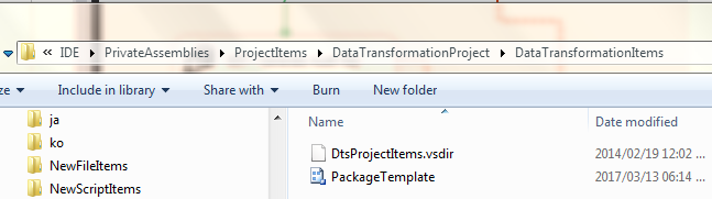 The next part involves saving and copying the package template developed into a drive location where Visual Studio is installed. The folder that you need to copy the template to is called DataTransformationItems and depending on your version of Visual Studio installed (in my case, I am using Visual Studio 2013), the path of the drive location should be as follows: