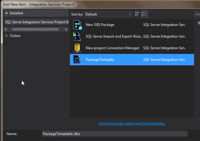 After you have closed and re-launched SSDT, the next time you add a new item into an SSIS project, the package template you added in Figure 2 will come up as one of the template options for your new item as shown in Figure 3.