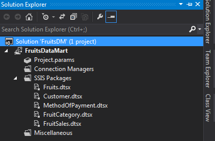 In order to understand and appreciate the Package Part feature in SSIS 2016, I will demonstrate some of the limitations we encountered in the traditional package template. A package template allowed you to create a package with shared controls that can later be used as a template for creating other packages. Say for instance you have a requirement to setup a data mart that stores fruit-sales data. Such a data mart might contain the following fact and dimensions: