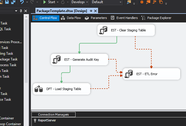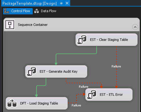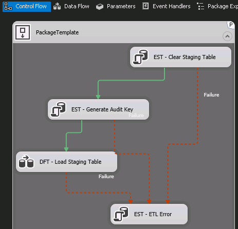 Working on Package Parts is similar to the way you work on SSIS Packages except that Package Parts have their own file extension, dtsxp. In Figure 10, we have created a Package Part that mirrors the traditional package template that was created earlier on.
