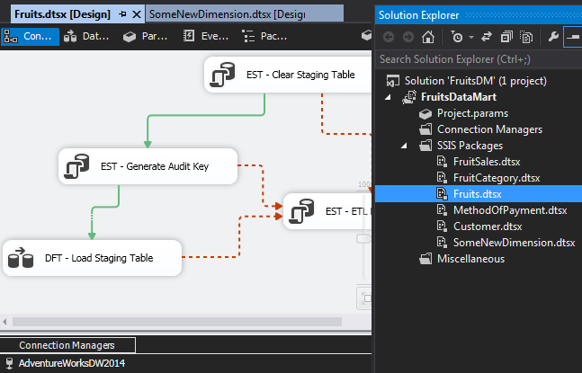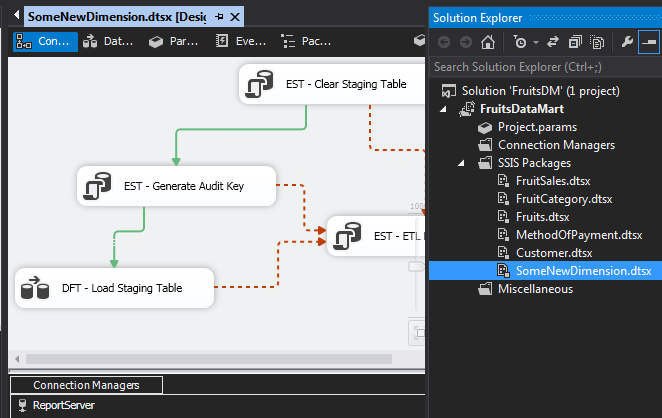 To check that the ensure is effective, I created a new dimension called SomeNewDimension.dtsx and as it can be seen in Figure 6, SomeNewDimension.dtsx has ReportServer connection name instead of AdvetureWorks2014.