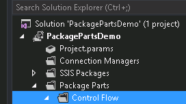 Package Parts enable us to produce package templates that are easier to manage and reuse. As from SSDT 2015, every SSIS project has a new Package Parts node, which in turn, has a Control Flow sub-node, as shown in Figure 8.